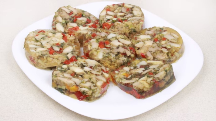 7. Приготовану закуску дістаємо з окропу і залишаємо на столі до повного охолодження. Після цього прибираємо її в холодильну камеру на добу. Застиглий рулет виймаємо з коробки і нарізаємо на порції.
