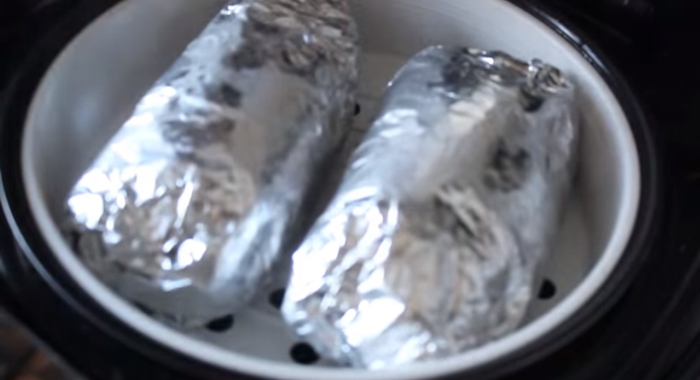 6. Після подачі звукового сигналу виждемо ще близько чверті години, потім відкриємо прилад, дістанемо вироби з чаші. Потім звільнимо рулетики від фольги і наріжемо їх на порції.