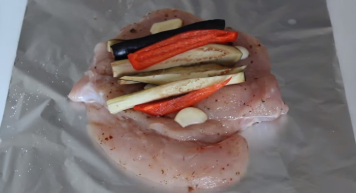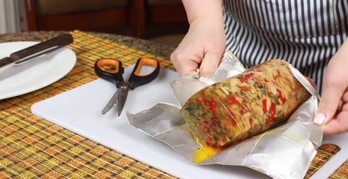 4. Звертаємо філе з овочами в рулет і щільно загортаємо його в фольгу. Намагайтеся не залишати щілин, щоб виділився з м’яса і овочів сік не просочився через фольгу. Те ж саме робимо і з другим філе.