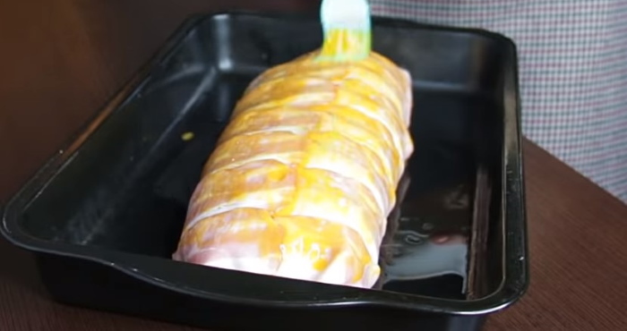 8. Заготівлю згорнемо в щільний рулет, стягуємо його джгутами або перевяжем ниткою, укладемо в змащену маслом форму і будемо запікати в прогрітій до 180⁰C духовці протягом півгодини. Через 30 хвилин верх обмажем медом і відправимо в духову шафу на десять хвилин.