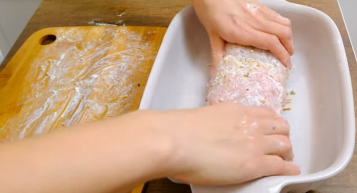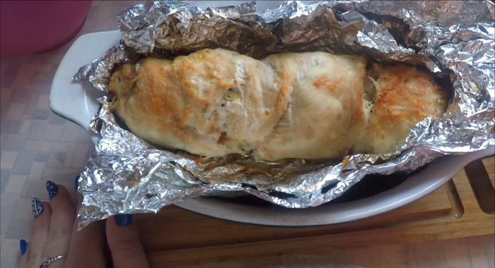 8. Рулет затягується харчовою плівкою і перекладається у форму для запікання, змащену невеликою кількістю олії. Після чого акуратно звільняється від плівкового полону, обмазується жовтком і відправляється в прогріту до 180⁰C духовку на 40 хвилин.