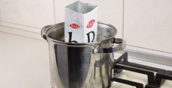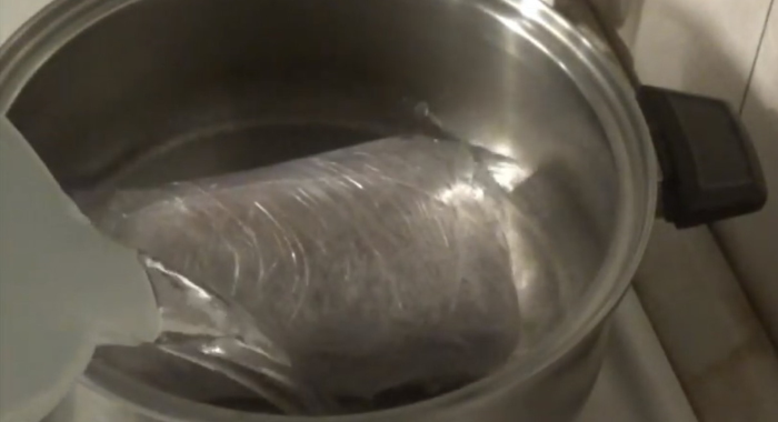 6. Ставимо заповнену коробку у високу каструлю, в яку наливаємо холодну воду практично до самого верху і ставимо ємність на сильний вогонь. Коли рідина почне активно кипіти, газ перемикаємо на середній і варимо рулет протягом 45 хвилин.