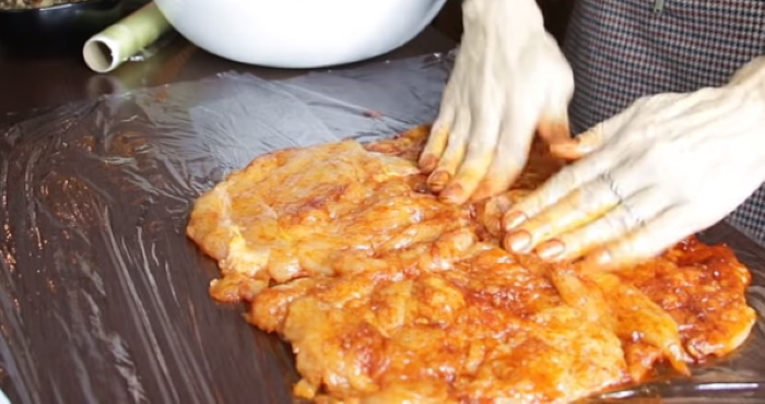 4. Робоча поверхня застеляється плівкою, після чого відбите м’ясо мачає в приправу і викладається на плівку, утворюючи прямокутник.