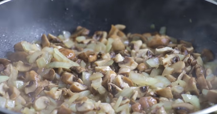 1. Очищена цибулина нарізати дрібним кубиком і обсмажується на соняшниковій олії до золотистого відтінку. Після цього в зажарку викладаються гриби, нарізані кубиками або слайсами, і готуються до тих пір, поки не випарується вся рідина.