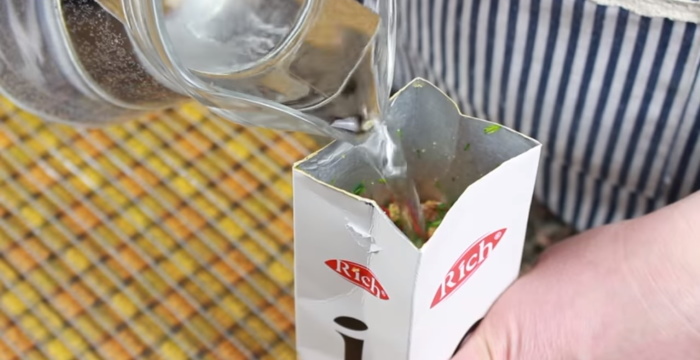 4. Потім беремо літрову коробку з-під соку, обрізаємо верх і добре промиваємо під проточною водою. Після цього укладаємо в тетрапак підготовлене м’ясо.