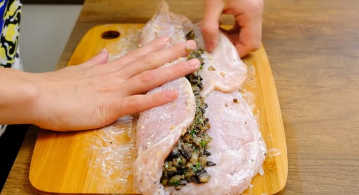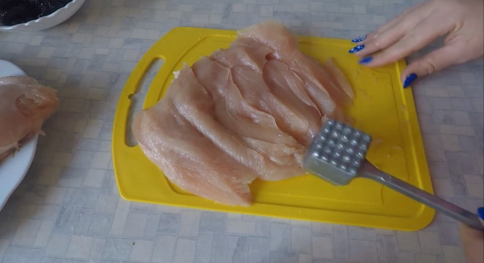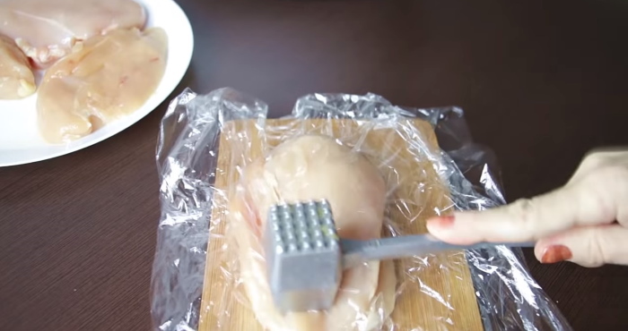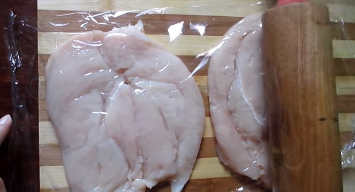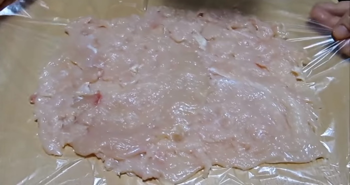 2. Поки начинка буде остуджуватися, займемося м’ясом. Кожну грудку разрежем, розкриємо книжкою, накриємо плівкою і добре відіб’ємо кухонним молоточком. Потім на робочій поверхні расстелем плівку, на яку викладемо підготовлену курку, закривши всі недоліки (якщо такі є) невеликими шматочками.