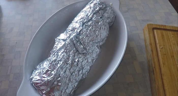 5. Після години з охолодженого м’яса знімаємо плівку, після чого загортаємо в 2-3 шари харчової фольги і викладаємо його у форму для запікання.