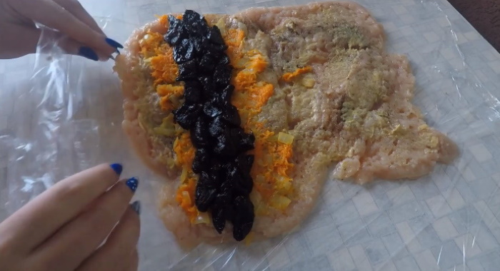 3. На половину м’ясного напівфабрикату викладаємо овочеву пасеровку, поверх якої розкладаємо порізаний невеликими шматочками розпарений чорнослив.