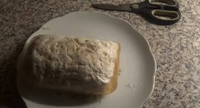 6. Ранок пляшку разрєжєм уздовж і виймемо з неї застиглий курячий рулет, повністю готовий до вживання.