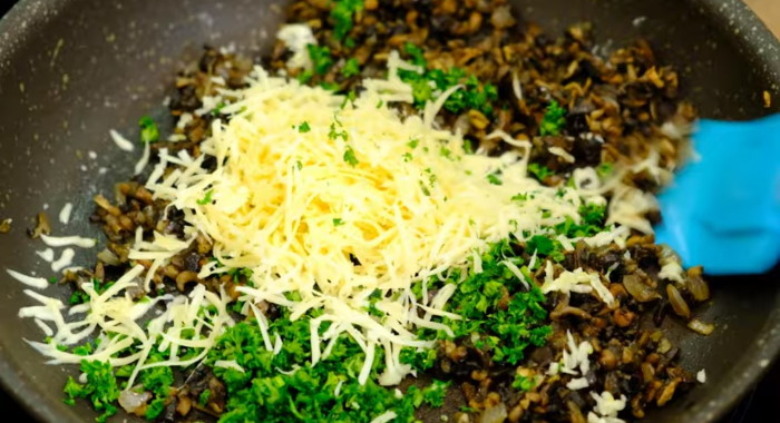 3. Цибулину, порізану дрібними кубиками, обсмажуємо до золотистого кольору з 2-3 ст. ложками олії. Потім в сковороду додаємо шампіньйони, порізані на маленькі шматочки, і продовжуємо смажити до готовності грибів. Наприкінці в зажарку викладаємо зелень і тертий сир, все швидко перемішуємо і відключаємо газ.