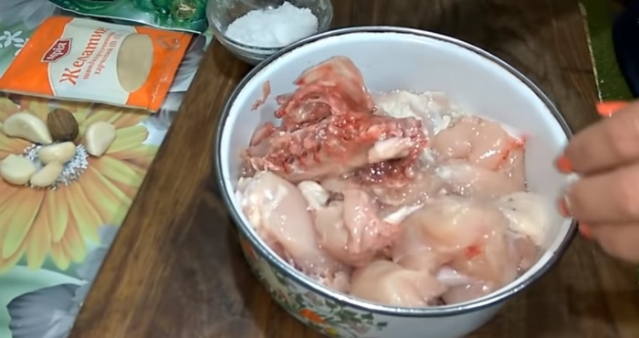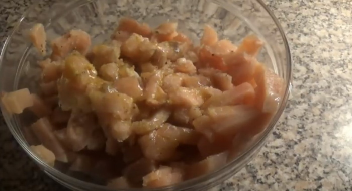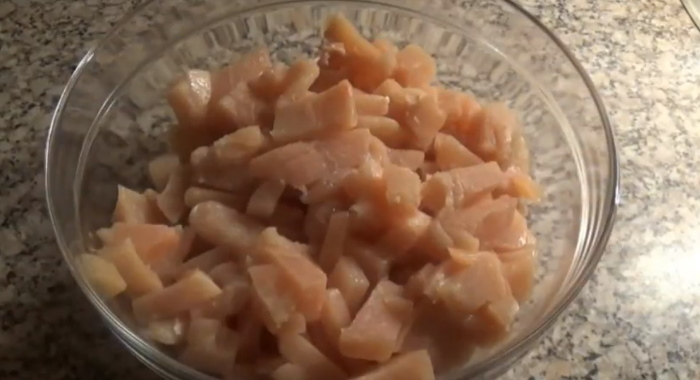 1. За допомогою гострого ножа з стегенця знімаємо шкіру і зрізаємо жир. Потім м’ясо відокремлюємо від кісточок і нарізаємо його на невеликі шматочки, які перекладемо в глибоку миску.