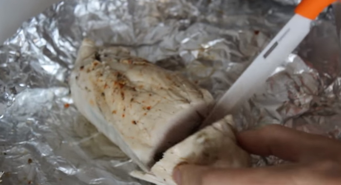2. Поки прилад нагрівається, займемося м’ясом. Для цього на робочій поверхні розстилаємо пласт харчової фольги. Філе натираємо сумішшю солі і спецій і викладаємо її на фольгу.