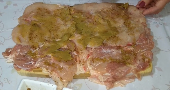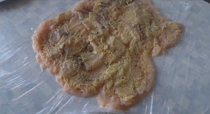 2. Робочу поверхню застеляємо харчовою плівкою, на яку викладаємо відбите м’ясо. Заготівлю солимо, перчимо, при необхідності посипаємо улюбленими спеціями і змащуємо невеликою кількістю гірчиці.