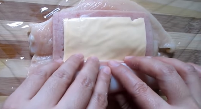 2. Покладіть на відбиту курячу грудку скибочки бекону або шинки і сиру, поверніть філе рулетом.