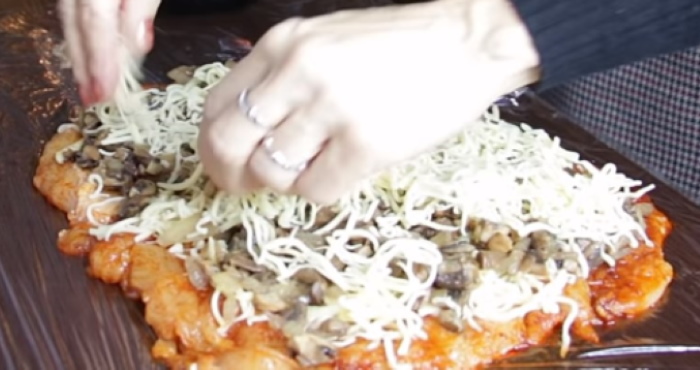 5. Заготівля посипається половиною сиру, заздалегідь натертого на валикочарункової тертці, потім по всій площі м’яса рівномірно викладаються гриби і засипаються залишилися сиром.