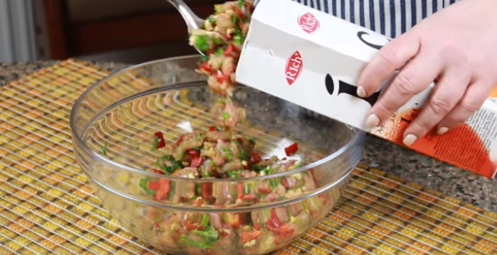 3. Заготівлю солимо, перчимо, додаємо улюблені спеції, всипаємо сухий желатин і ретельно перемішуємо всі інгредієнти.