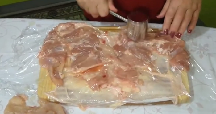 3. Грудка застеляється харчовою плівкою і відбивається кухонним молоточком з обох сторін до отримання тонкого шару. Так само чинять з усіма шматочками.