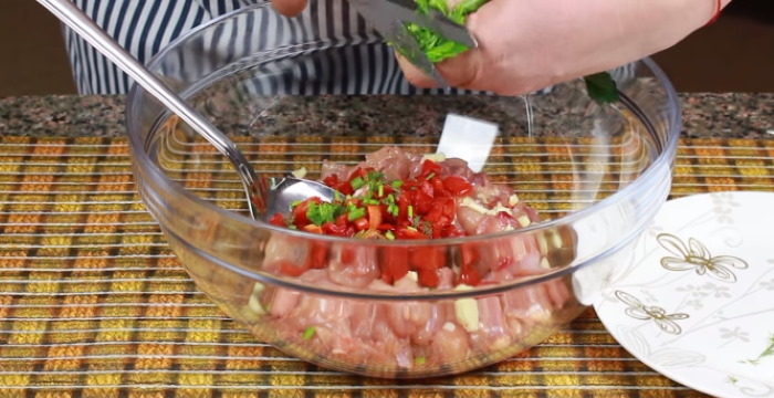 2. До м’яса додаємо подрібнений часник, поросяти, ягняти солодкий перчик і зелень.