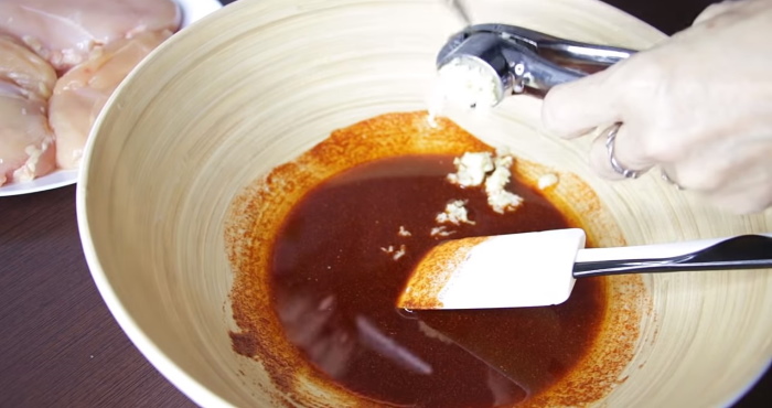 2. Поки начинка готується, в окремій мисці змішуються: паприка, сіль, сушену і свіжий часник, оливкова олія. Інгредієнти ретельно перемішуються.