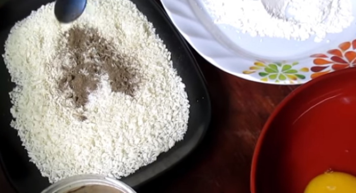 4. По окремих страв розкладіть борошно, та хлібні крихти, розбийте яйця. Приправте кожен інгредієнт сіллю і перцем. Добре перемішайте.