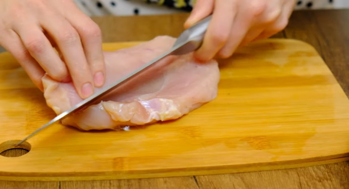 1. Курячу грудку гострим ножем розрізаємо вздовж, не доходячи до кінця, відкриваємо і відбиваємо кухонним молоточком. Те ж саме робимо з другим шматком.