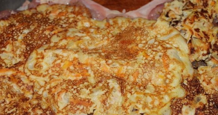 7. З отриманого тесту спечемо на сковороді 3 млинця, які розкладемо по маринованному м’яса.