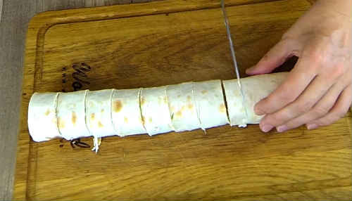 - Звертаючи закуску, трохи приминають скручену корж рукою, рулет повинен бути щільним.