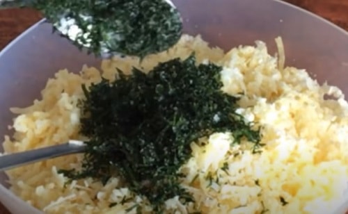 Покришите гілочки кропу. Гарненько розмішайте начинку. Якщо знадобиться, вбийте ще одне яйце.