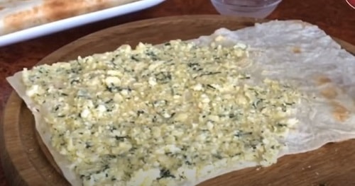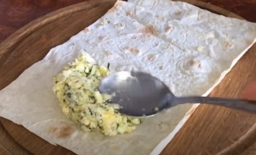 - Розстелите лаваш, викладіть половину наповнювача, розподіліть по поверхні.