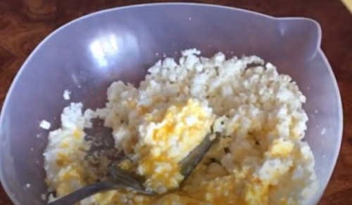 - Складіть в миску сирний продукт, цукор, одне яйце, білок другого. Розітріть масу до однорідного стану.