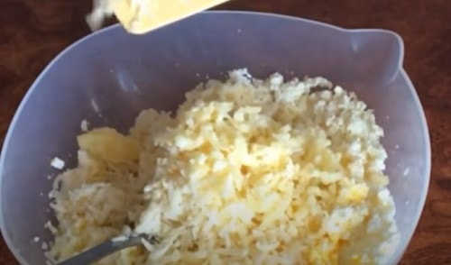 Натріть сир крупною стружкою, відправте в начинку, знову перемішайте.