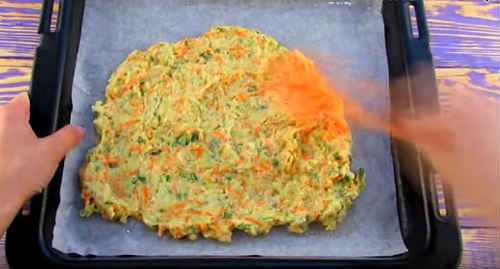 Постеліть на деко пекарську папір, промажте її маслом. Розподіліть кабачкове тісто рівним шаром.