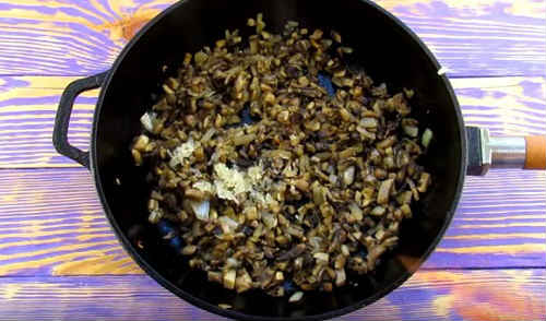 Поріжте довільно гриби, відправте до цибулі. Посмажте начинку до готовності. Не забудьте посолити і трохи поперчити.