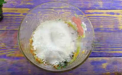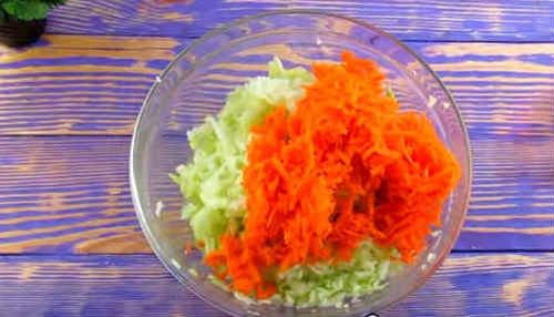 Кабачок і моркву потріть великої стружкою, присоліть, дайте постояти на столі хвилин 10, не більше. Відіжміть зайвий сік.