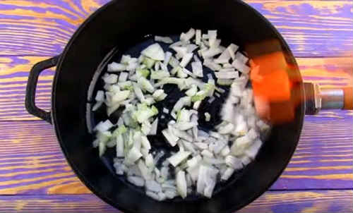 Поки основа рулету запікається, зробіть начинку. Для цього дрібно покришіть цибулину. Киньте в розпечене масло обсмажуватися.