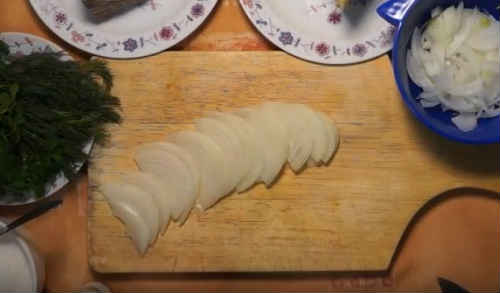 Заздалегідь наріжте півкільцями цибулину, помістіть в піалу.