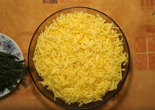 Далі, на яйця укладається сир, натертий великої стружкою.
