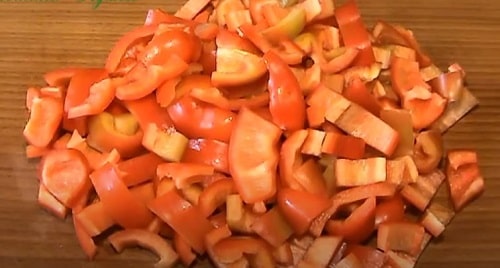 У солодких перців виріжте насіння, перегородки. Настрогайте м’якоть скибочками, не дуже крупно.