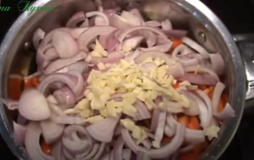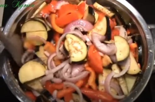 Складіть всі підготовлені інгредієнти в каструлю, налийте на дно її рослинне масло. Викладайте спочатку шарами.