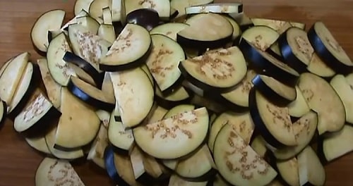 - Обріжте у баклажанів хвостики, розрізати уздовж пластинами, потім поріжте на кубики.