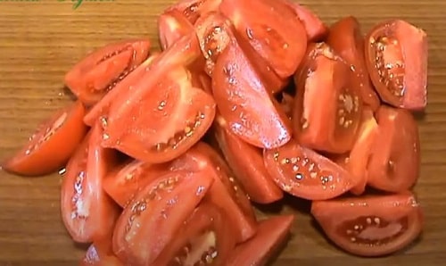 - Поріжте помідори. Якщо вони щільні і м’ясисті, то можна різати кубиками. В іншому випадку, краще поділіть великими часточками, щоб зберегти форму нарізання.