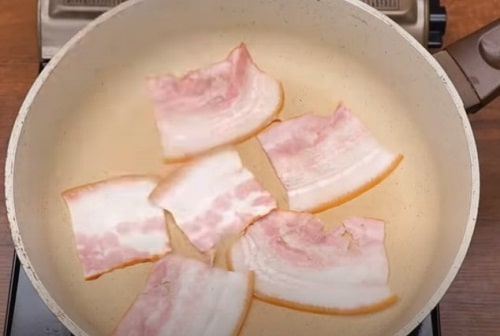 Смужки бекону наріжте на частини. Обсмажте на сковороді, поки не стануть хрусткими. Після перекладіть на паперову серветку, щоб вбралося зайве масло.