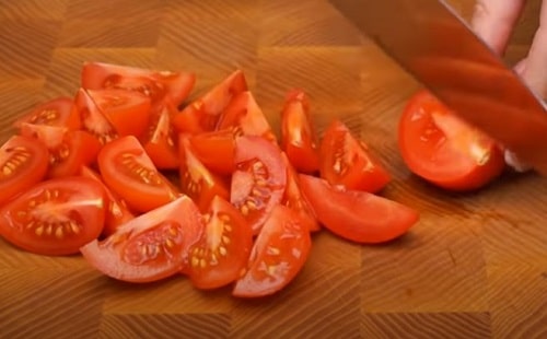 - Помідор поділіть на 4 частини, видаліть рідку частину. М’якоть покришіть дрібним кубиком.