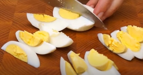 Заздалегідь зваріть яйця, потім поділіть їх четвертинками.