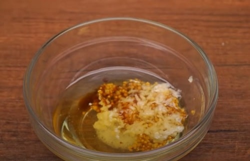 - Приготуйте заправку, змішавши зазначені в складі рецепту інгредієнти. Спочатку з’єднайте рідкі складові, потім введіть цукор, тертий в крихту сир.