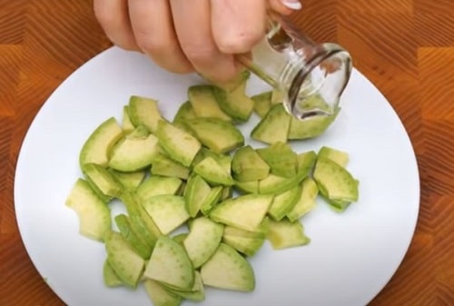 - Почистіть авокадо, нашаткуйте поличками, збризніть лимонним соком, охороняючи від потемніння.