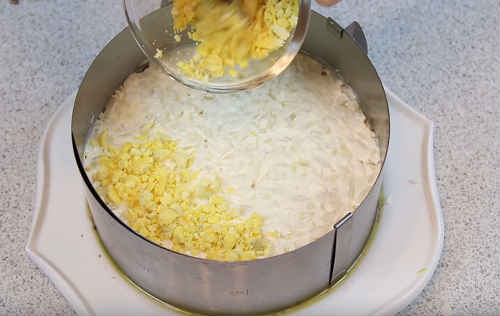 Рецепт класичної Мімози шарами з рисом і сайрою