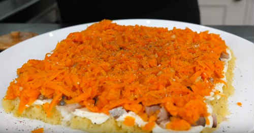 Наступний шар – морква. Також трохи підсолена і присмачена перчиком.