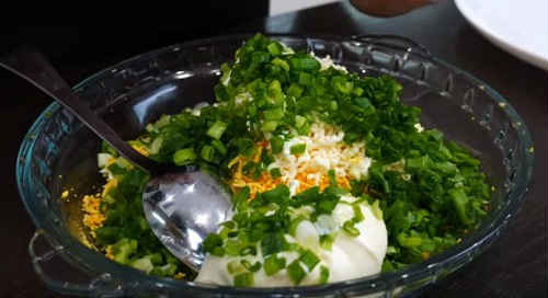 Порубаєте зелений лук, відправте до сиру з морквою, додайте пару ложок майонезу. Розмішайте вміст миски.