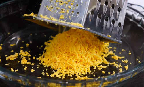 - Подрібніть сир на дрібній тертці, цибулю покришіть маленьким кубиком.